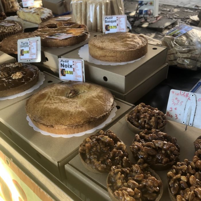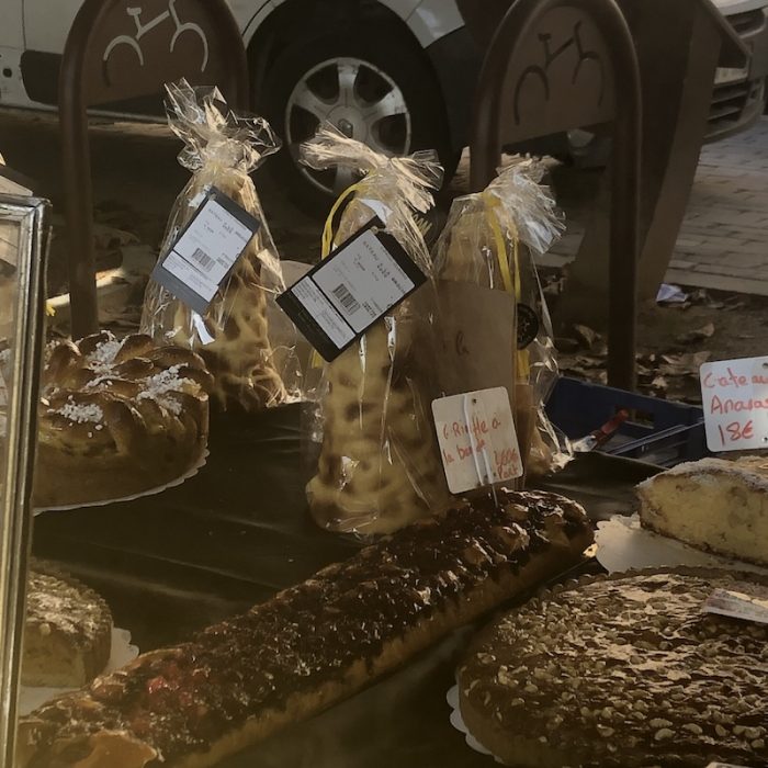 真ん中のパッケージされたのがこの地で売っている Gateau a la broche(ガトー ア・ラ・ブロッシュ)横に切るとバームクーヘンのように生地が巻いてあるのがわかります。